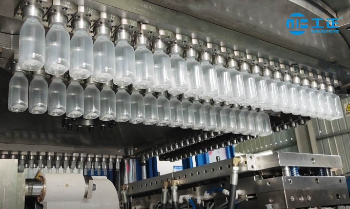 这是一款双模联动的高产能一步法注、拉、吹中空成型设备,昵称“双子星”。他是一步法四工位机的升级版,全球独创的双模联动结构让设备占地更小、产能更大、自动化程度更高,且更加节省能耗。这款设备还可以同时生产两种不同规格、形状的瓶子。特别适合用于生产医药包装(如输液瓶)、饮料瓶等产能要求特别大的产品。